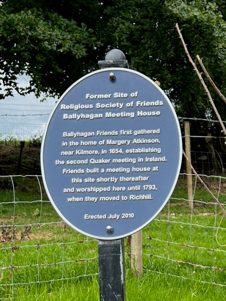 We drive a bit further in search of a “newer” Quaker Graveyard Seamus had explained was “two roads down on your right and over a wee bridge.” We look but cannot find it. We pass by a woman and ask if she might know of it. She says no, but kindly says, “Let me call me mum; she’s a Quaker; she’ll know.” She does, but her “mum” doesn’t know of any graveyards in the area. We thank her.