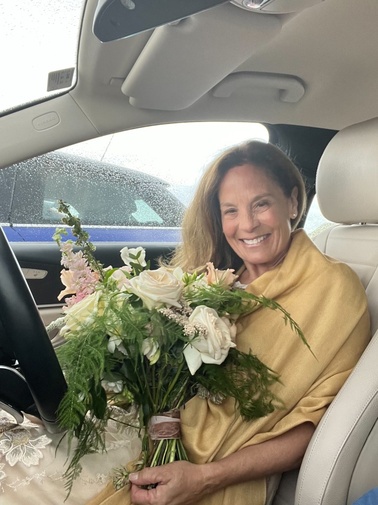 Finally, I climb in with my knees up to my chin, race up the driveway, run in, follow Cathy out to the car, a bouquet in one hand, our day packs in the other. We plop into our seats. Cathy pushes the button to start the engine.