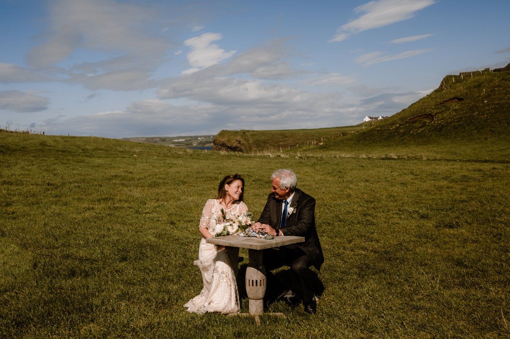 The ladies ooo and ahhhh over Cathy’s dress. Sam’wife—a short, solid, no nonsense woman with short gray hair– teases him, “How come, ye’ve never been so romantic?” Sam shrugs and looks to Sean for help. The small cottage is filled with laughter. Sean hands Cathy and me a 20 euro note and makes us promise to buy two proper glasses of Irish Whiskey at our next pub as a wedding gift from him.