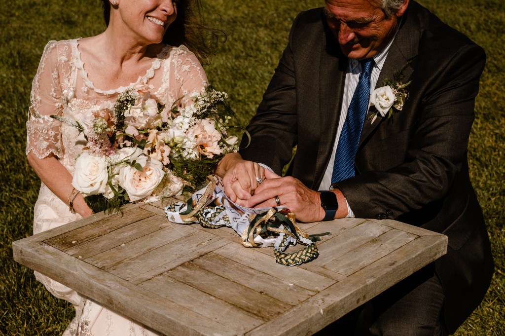 Rings exchanged, vows exchanged, Sam leads us through the handfasting ceremony. Holding one another’s hands, he weaves the beautiful braid Cathy, Jackson, Avery, Finn, Grady, Olive and Rhyse have made, around each of our wrists. We officially “Tie the Knot” in the Irish way.