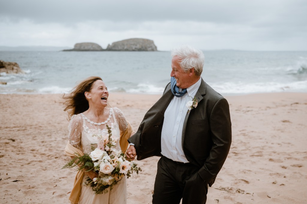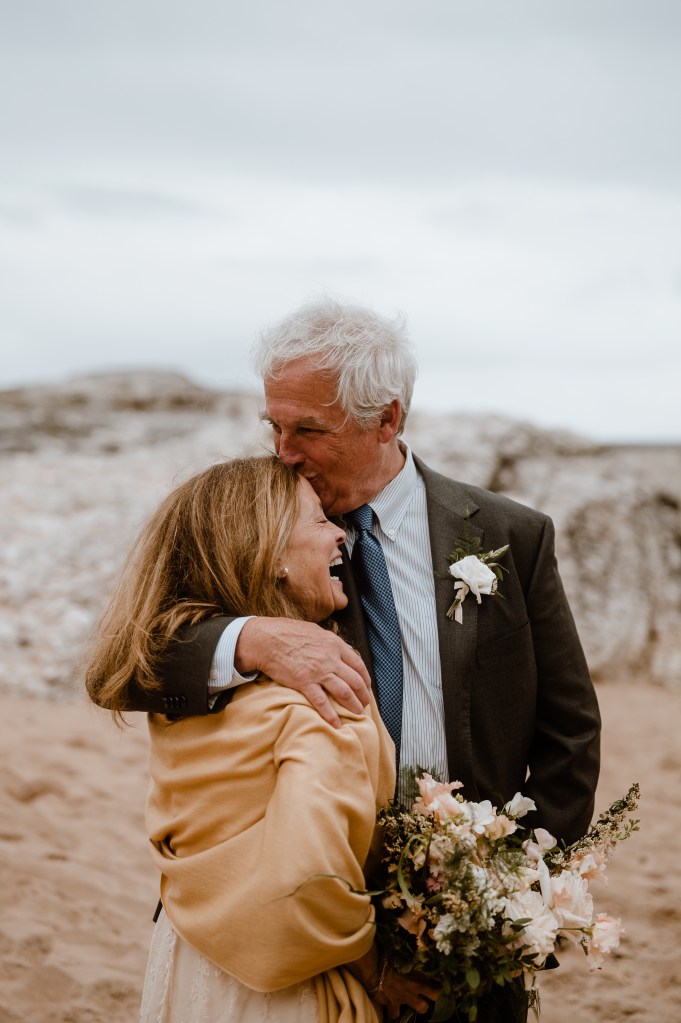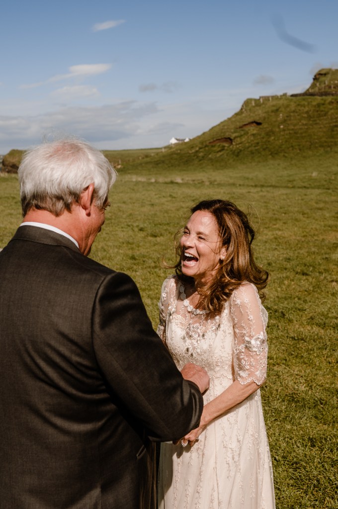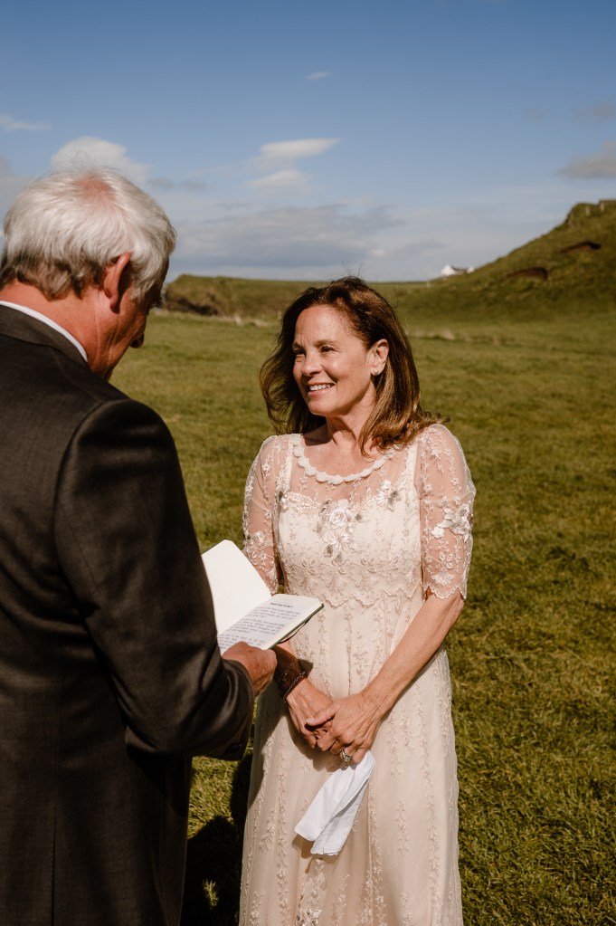 The ceremony is brief. Sam, with a soft Irish lilt, has done a masterful job of preparing just the right words, using the “stories” he asked us each to write, but not share with one another, and weaving those stories of how we came to fall in love with his own comments about marriage, poetry we selected, and just the right amount of humor. He has us both crying and laughing.
