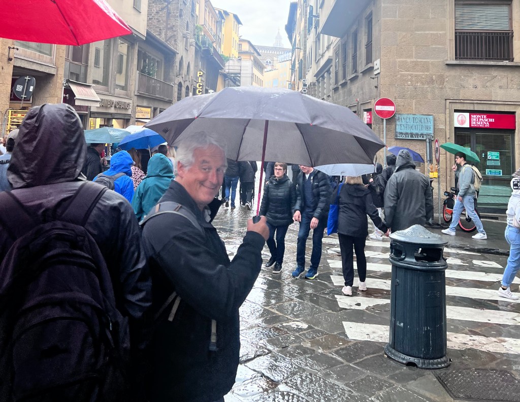 Pedestrian battle is particularly treacherous on the Ponte Vecchio in the rain. My little REI expandable umbrella is no match for Japanese tour groups wielding bumpershoots the size of Hokaido. Watch yourself. These gals don’t subscribe to Michelle Obama rules. When you go high, they go low so the tips of the ribs of their umbrella dart past you at just about eye level.