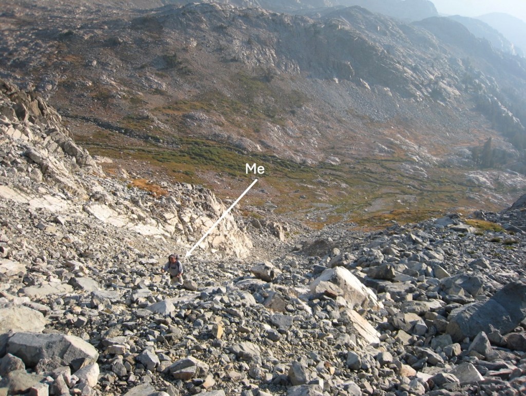 Our plan was to climb the scree field left by the retreating glacier. Here’s I am knee deep in scree. I’m the 51-year-old bozo launching f-bombs down at Lake Ediza.