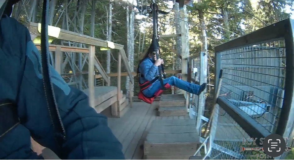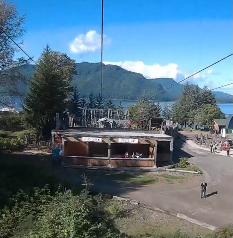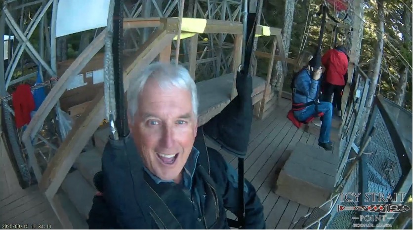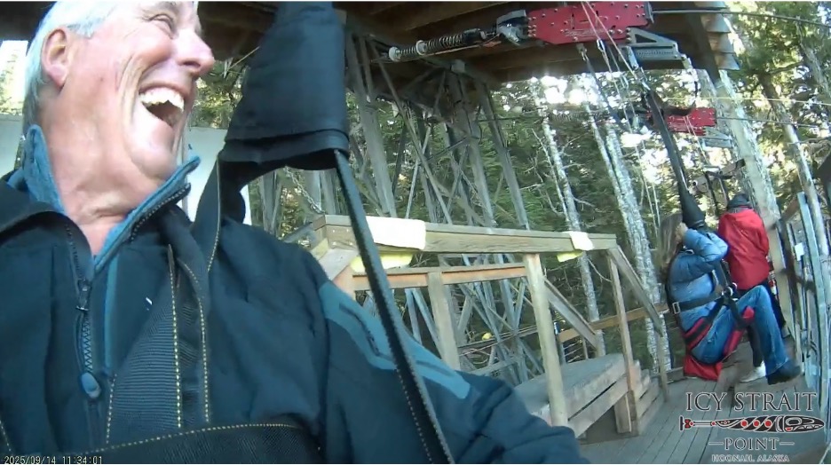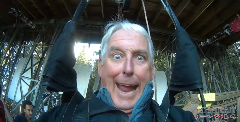 You see, the Icy Strait Zip Line is the world’s largest zip ride. It is 5,495 long, falls 1,330 feet and is higher than the Empire State Building. Six test subjects, I mean tourists, on parallel wires reach speeds of 65 mph on a 25% grade.